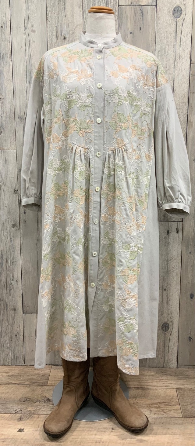 ◆ブランド:コットンハウスアヤ ◼️日本製 ◼️商品価格 ¥40700(税込価格)→ ¥20350(税込価格) ◼️素材 綿100% 刺繍糸 綿100% ◼️サイズ 胸幅 約120cm 肩幅 約55cm ドロップショルダー 袖幅 約43cm アームホール 約49cm 袖丈 約41cm 着丈 約113cm ウエストあたり 約135cm 裾幅 約190cm アヤさんお得意のエンブロイダリ刺繍の前開きワンピース 製品洗いをしています 優しいソフトな綿生地に優しいナチュラルな花と葉っぱ模様の刺繍がとても素敵です 前見頃の中央部分の少しのギャザーが更にナチュラルさをアップ 前開きタイプですので秋春の羽織り物にも活躍します 袖口のギャザーもふんわりナチュラルです 左右ポケット有り ※インナーカットソー、ジャンバースカートは別売り