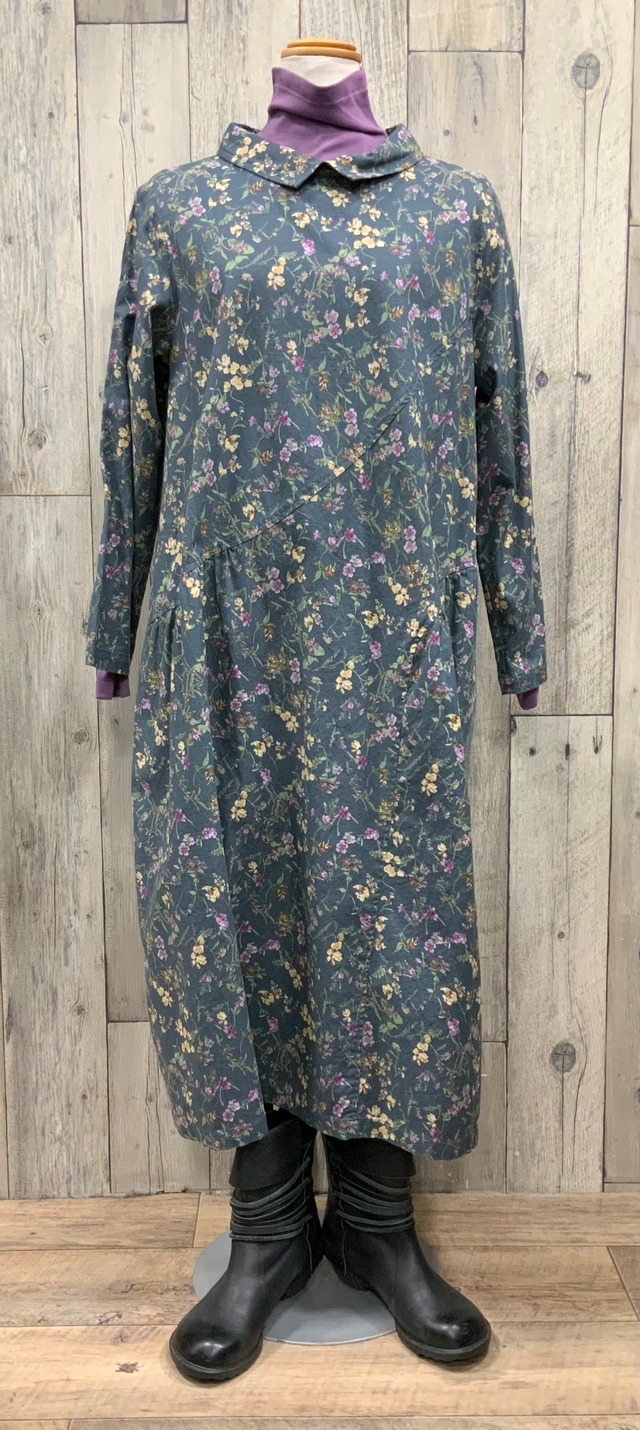 ◆ブランド:イフクラージュ ▪️日本製 ▪️商品価格 ¥27500(税込価格)→ ¥13750(税込価格) ▪️素材 綿100% ▪️サイズ 胸幅 約104cm 肩幅 約39cm 袖幅 約40cm アームホール 約50cm 袖丈 約54cm 着丈 約106cm ウエストあたり 約120c m 春、秋素材の透け感の無い花柄ワンピース 前見頃は袖付け部分から腰あたりにかけて斜めに切り替えて少しだけギャザー 前見頃左サイドのポケット部分から裾にかけて斜めに切り替え少しだけギャザー 後ろ見頃はウエストより下部分にギャザー ※インナーハイネックは別売り