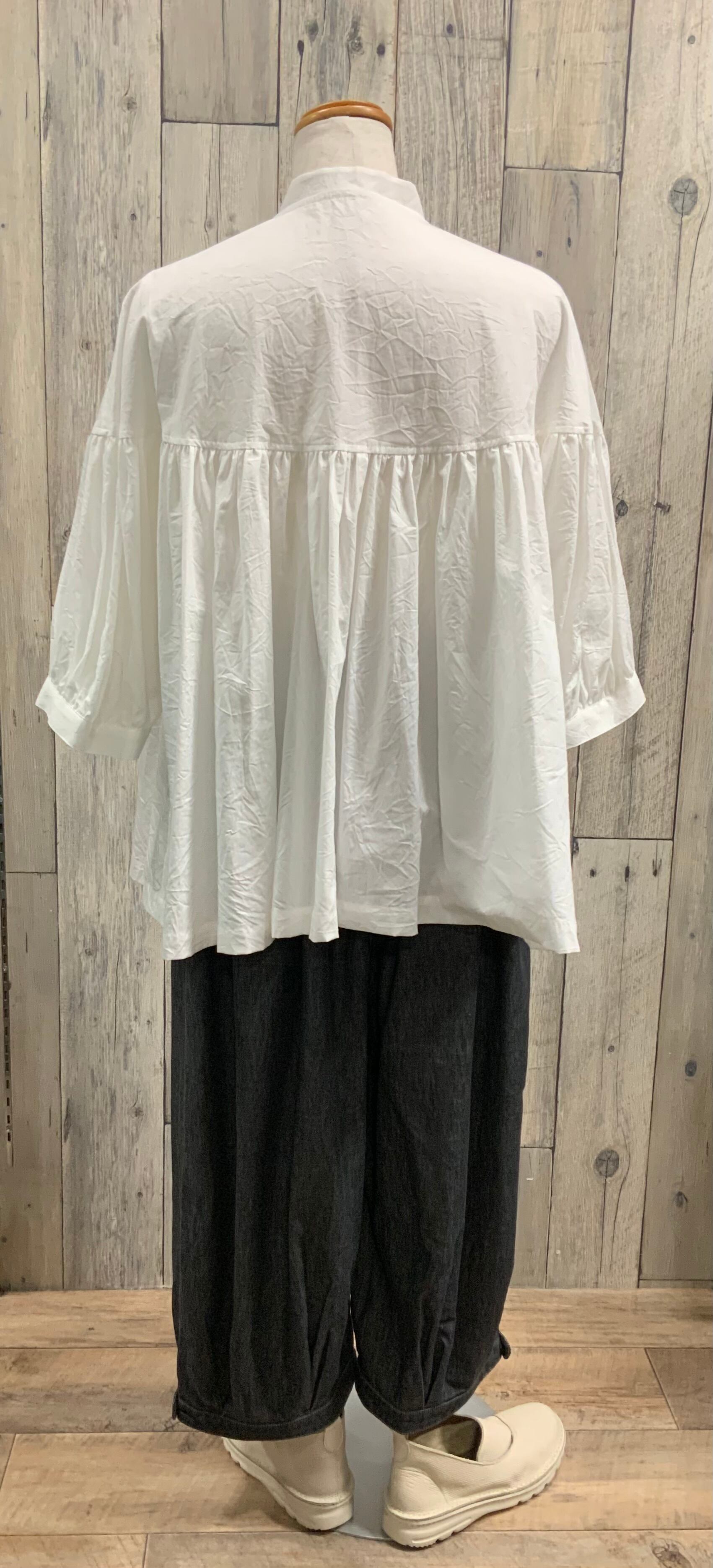 ドロップショルダーのギャザーたっぷりのボリューム感がポイント