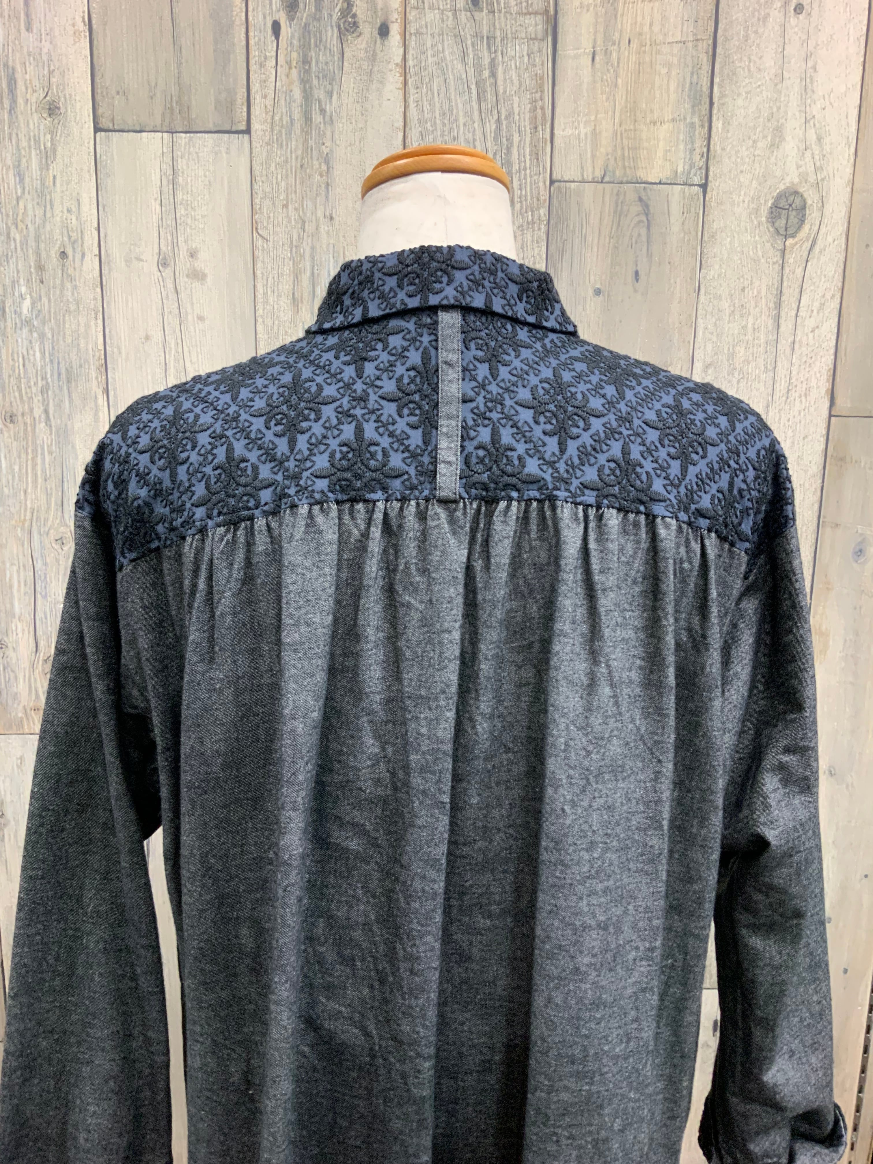 紺地の生地に黒のエンビロイダリ刺繍を胸元と後ろ見頃の肩部分と袖の折り返し部分に使いナチュラル仕立てとなります