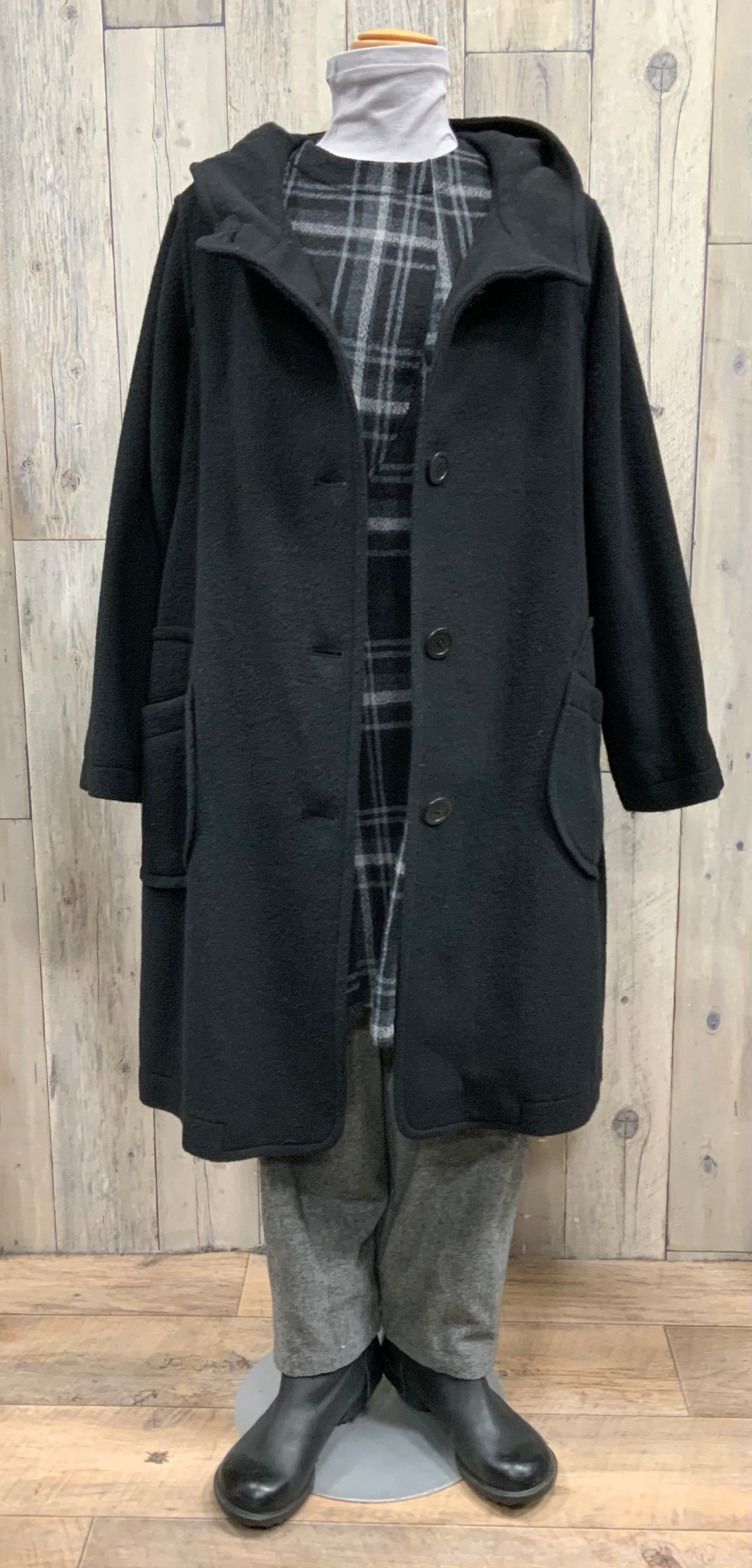 ロングブーツとも相性の良いフードハーフコートです