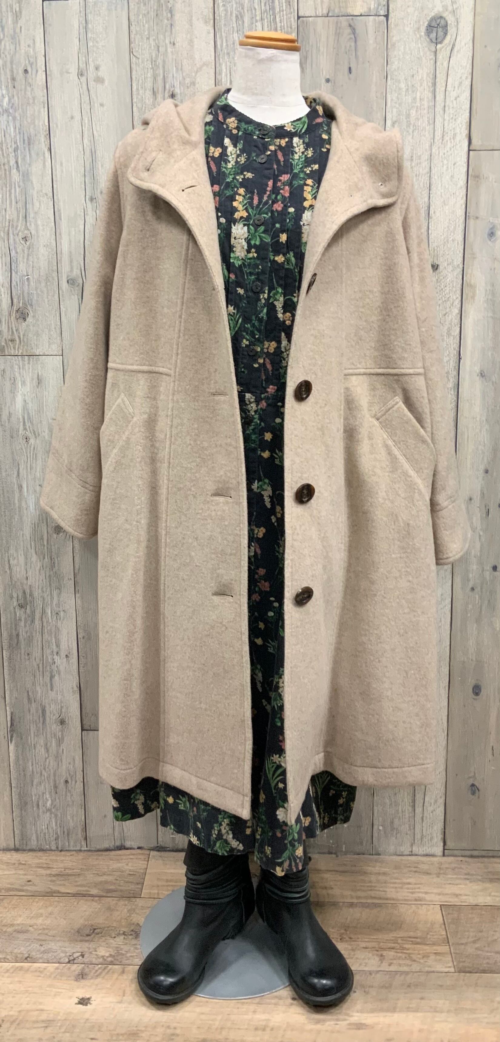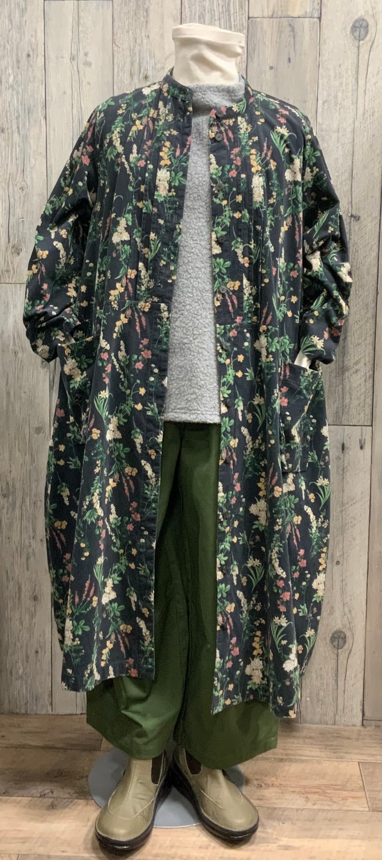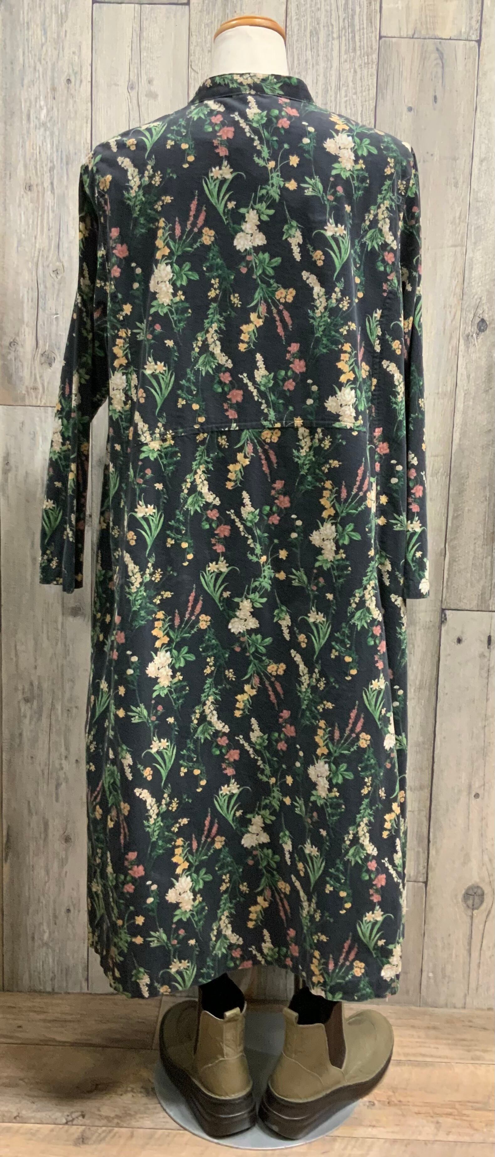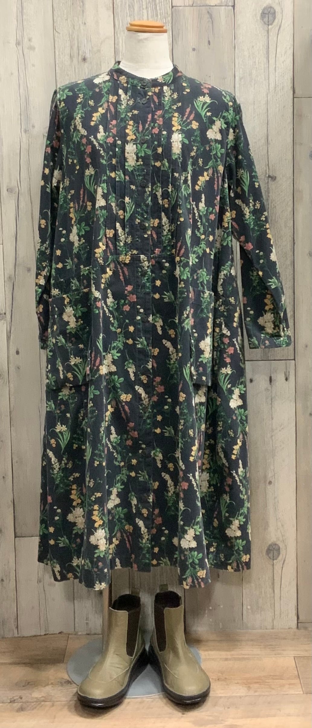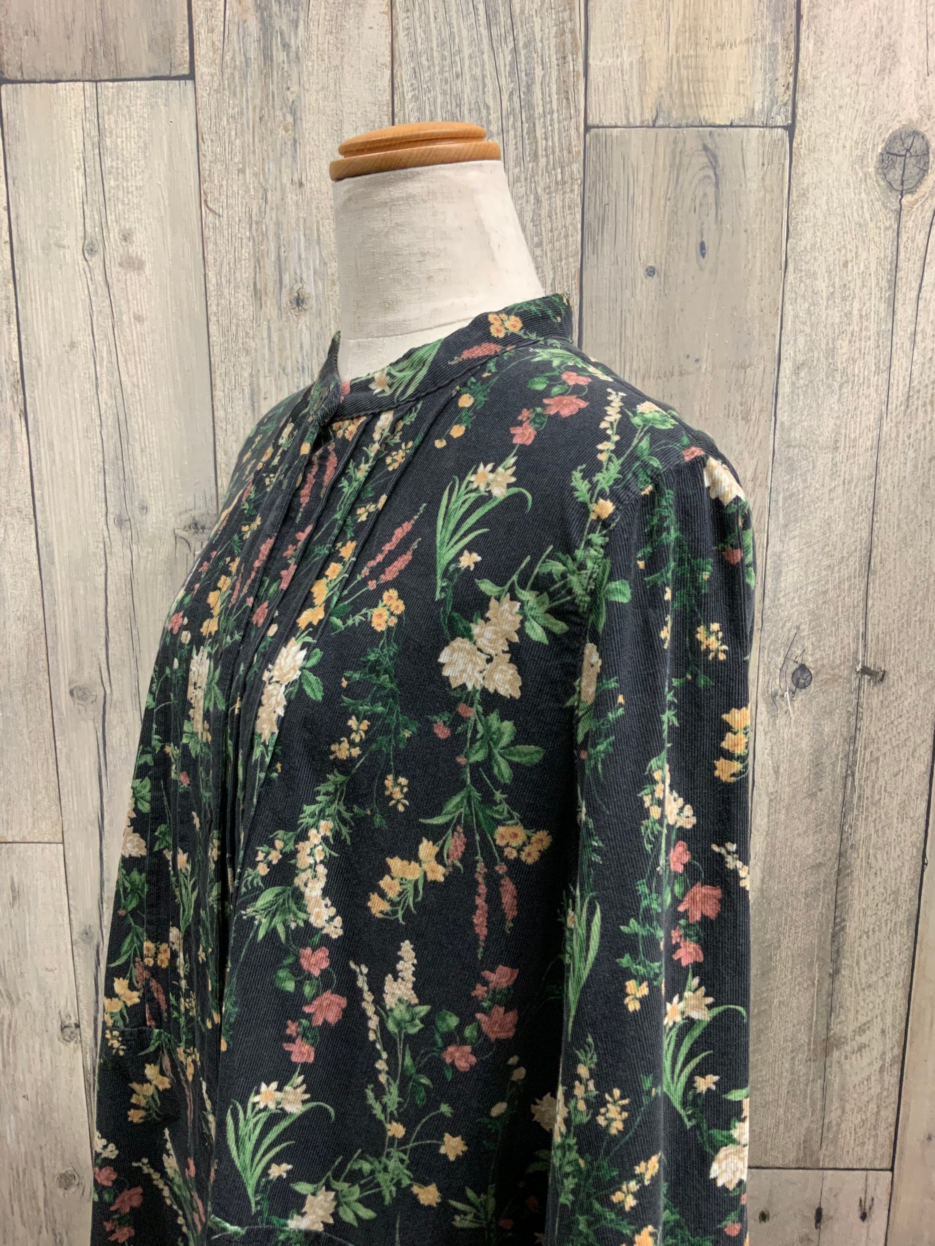 襟なしの前開きの綿コーデュロイ花柄ワンピース